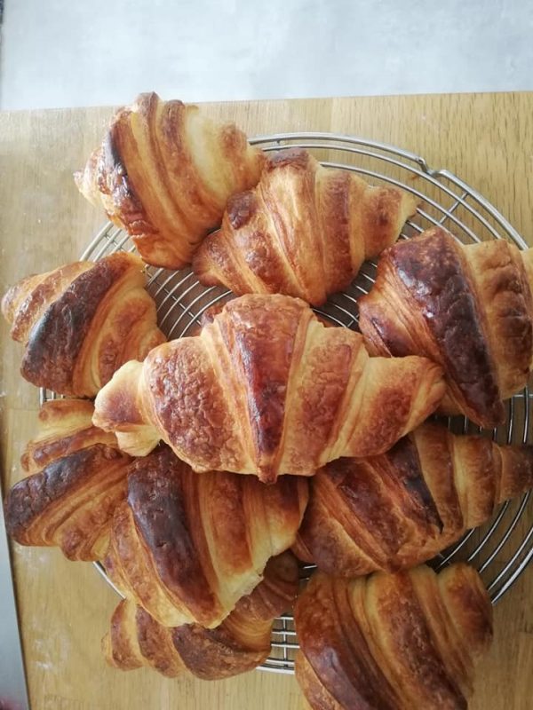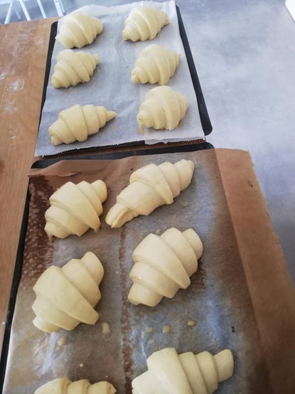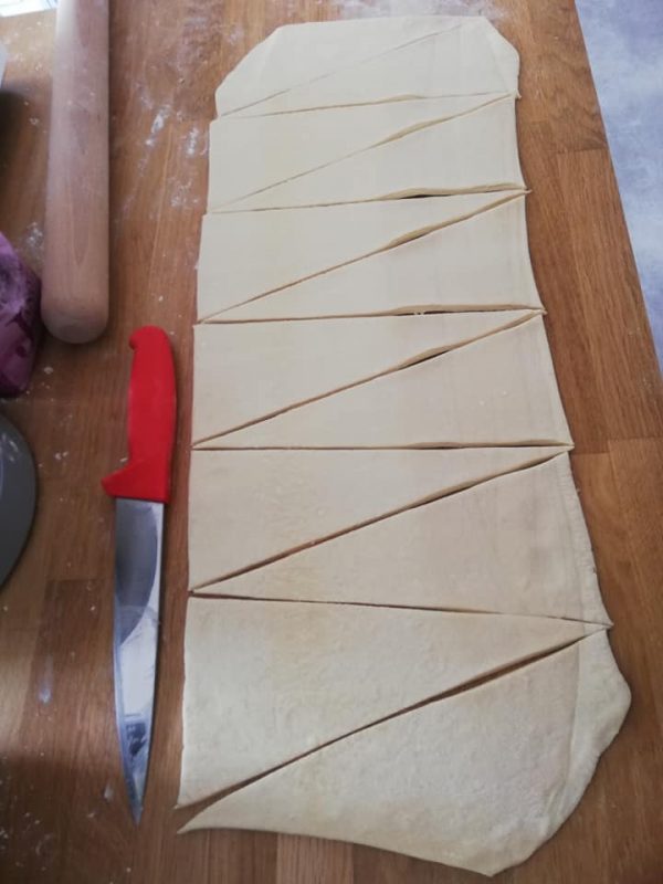 4. Faire des triangles de 20 x 10 cm environ Rouler chaque triangle en finissant par la pointe (Faire des petits croissants avec les bordures pour ne pas gaspiller...) Préparer 2 tôles beurrées ou recouvertes de papier cuisson. Y déposer les croissants (environ 9 par plaques) en les espaçant un peu