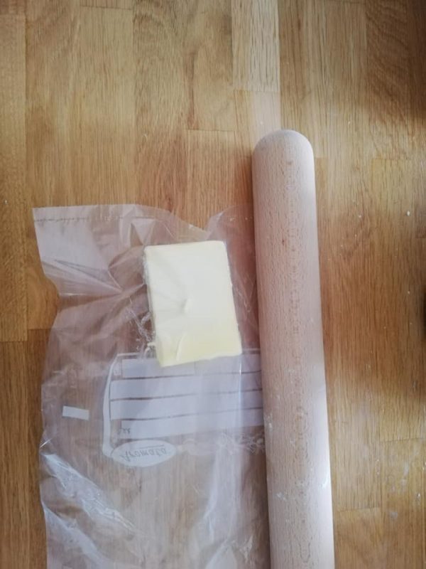 2. Beurrer la pâte : étaler la pâte sur un plan de travail fariné à l'aide d'un rouleau à pâtisserie fariné. attention au beurre qui ne doit PAS être trop mou !! Il doit avoir à peu près la même consistance que la pâte : le déposer au milieu sur la pâte en l'étalant, sans en mettre sur les bords