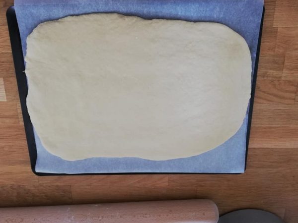 3. Laisser reposer 30 mn au réfrigérateur pour raffermir car le beurre a tendance à fondre. Ne pas hésiter d'ailleurs à mettre la pâte au réfrigérateur au cours des pliages si on sent qu'elle est trop molle (cela dépend aussi du temps...) Étaler la pâte finement, régulièrement, selon un rectangle d'environ 40 x 50 cm pour la découper en 2 bandes d'environ 20 cm x 50 cm