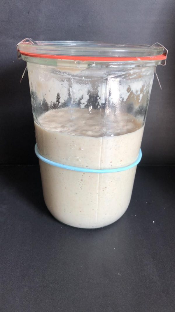 - Indications générales et conseils : – Le levain est une fermentation des bactéries qui se trouvent dans l'air, l'eau et la farine. Donc celles-ci varient d'une maison à l'autre, et c'est pour cette raison qu'il y a autant de recettes et de conseils différents. – Si vous expérimentez une recette, suivez-là à la lettre, ne faîtes pas un panachage de tout ce que vous trouvez ici ou là, c'est le meilleur moyen de rater. – Plus le chiffre à côté de la lettre T de votre farine est élevé, plus votre farine est complète. – L'utilisation de farine la plus complète possible permet d'avoir un levain avec beaucoup de force. Pour démarrer un levain, la farine de seigle T170, est conseillée. Ensuite pour nourrir ou rafraîchir le levain-chef, toute farine bio convient. – N'utilisez pas de farines industrielles ou dites « farine pour pain », elles contiennent du sel et des additifs que le levain n'apprécie pas. – Il n'y a pas besoin d'ajouter de raisin sec ou de yaourt. Le levain c'est 50% de farine et 50% d'eau, rien d'autre. – L'ajout de miel au départ permet de faciliter la prise du levain car les bactéries qui vivent dans le levain adorent le sucre et parce que le miel contient un antiseptique et permet d'éviter la moisissure. – Utiliser un bocal en verre type conserve le Parfait d'un litre. – Commencez par ébouillanter votre bocal, cela permettra d’augmenter la température. Le levain naturel aime les températures tièdes, autour de 24/25°c. – Pour faire naître un levain, le bocal ne doit surtout pas rester fermé, le levain doit respirer. Laisser le couvercle juste posé dessus. Mais il est recommandé de le couvrir avec un tissu léger (type voile) pour que rien ne puisse y entrer (mouche, moucheron, insecte). Dans ce cas il faut lever entièrement le couvercle. (cf image) – Quand on parle d'eau « tiède » c'est parce si elle est trop chaude ça ne marche pas mieux, c'est même le contraire car le levain meurt à 50°C. En touchant l'eau, la température doit vous sembler à peine chaude. – Pour démarrer plus facilement un levain l'idéal est de placer le bocal au-dessus du chauffe-eau, il y fait très bon, sans risquer que ce soit trop chaud comme posé directement sur un radiateur ou au-dessus du poêle à bois. – Préférer une eau de source. Si vous prenez l'eau du robinet celle-ci ne doit pas être trop chlorée. Si vous avez un doute, laissez l’eau du robinet reposer dans une carafe pendant deux à trois heures, cela permettra l’évaporation du chlore. Le chlore tue les bactéries nécessaires à la fermentation du levain. – Si certaines recettes parlent de sel (même dans certains livres) il n'y a pas de sel dans le levain !! – La consistance du tout premier mélange farine/eau doit ressembler à une pâte à beignet. Elle ne doit pas être trop liquide comme la pâte à crêpe, elle ne doit pas non plus être trop ferme comme une pâte à tarte. – Un levain qui fermente bien doit lever et buller et son odeur est aigre mais pas une odeur de pourri ! Pour vérifier qu'il lève bien, mettre un élastique autour du bocal en verre au niveau du mélange. (cf photo) – Le levain est un mélange vivant, il est normal qu'il lève puis retombe selon ses propres cycles. Quand vous prélevez du levain de votre levain-chef pour faire votre pâte à pain, il faut faire le prélèvement au moment où il est haut. – Certains laissent reposer le premier mélange 3 à 4 jours sans apporter de farine et d'eau et utilisent ainsi ce premier levain directement pour faire leur pain. Certains le nourrissent les trois premiers jours, une fois le matin, une fois le soir, d'autres une fois seulement par jour. Mais en général plus un levain est nourri en cours de fermentation, plus il est actif et mieux le pain lèvera. – Le levain est opérationnel lorsqu'il a poussé au moins trois fois de manière consécutive. Compter en général 4-5 jours. – Certains gardent une portion de leur tout premier levain-chef qu'ils continuent à nourrir pendant des mois voire des années. Mais il est conseillé de prélever une nouvelle portion de pâte au moment où vous faite votre pâte à pain, cette portion de pâte devient votre nouveau départ de levain qu'il faut renourrir. Par le pétrissage de votre pâte à pain, vous dynamiser votre levain du départ. Plus votre levain a été travaillé et nourrit meilleur il sera.